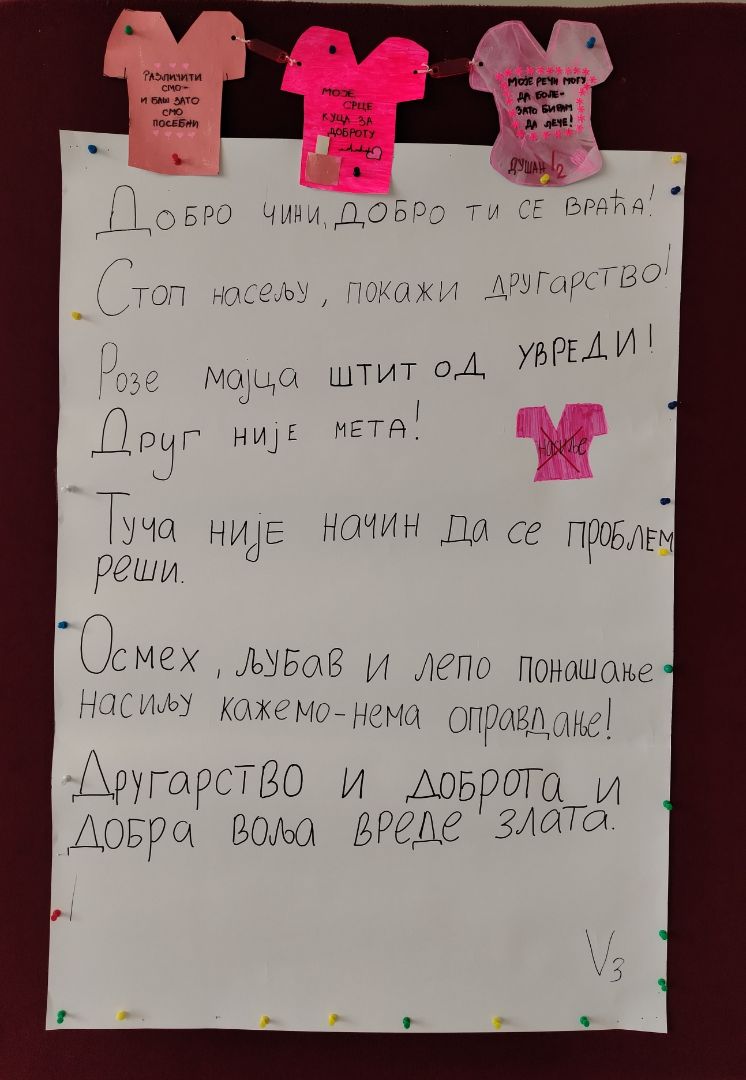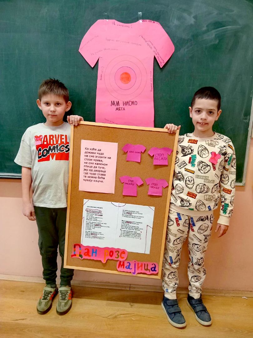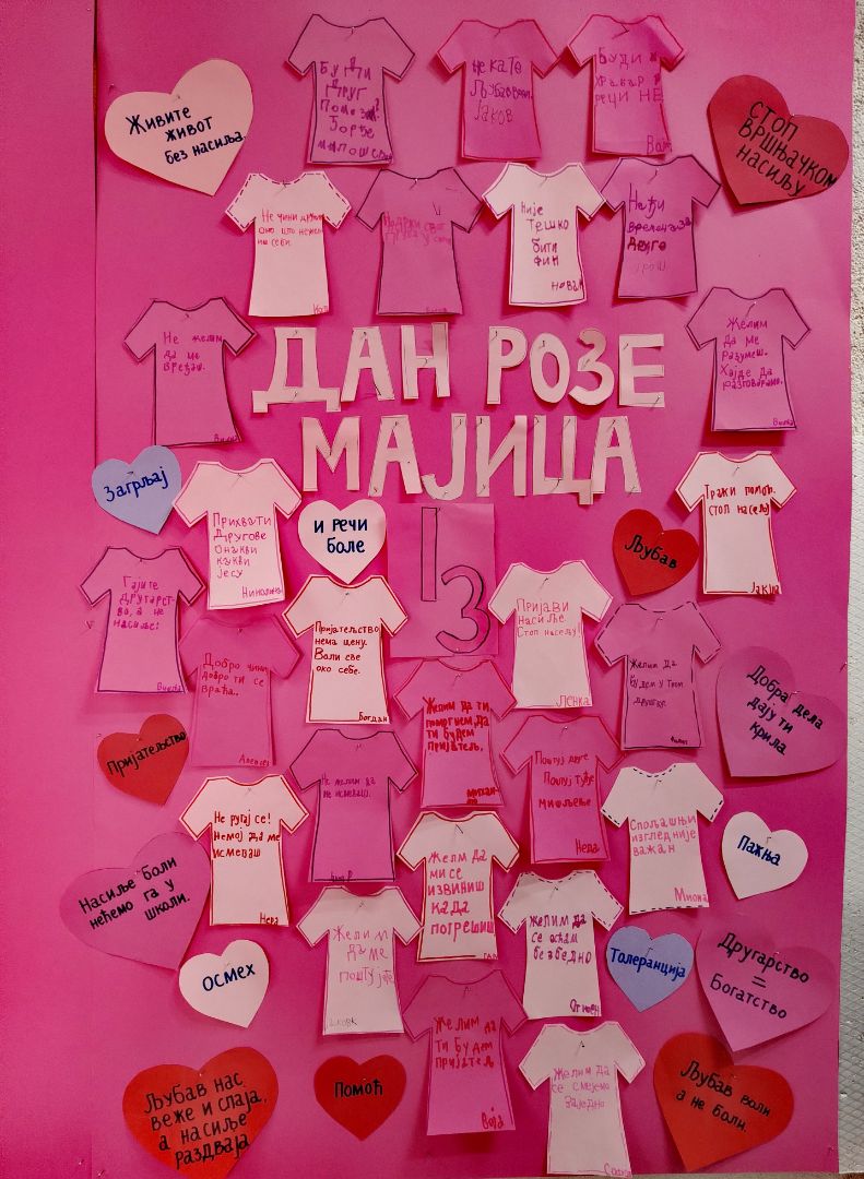 Ове године Дан розе мајица је био 25.фебруара. Ученици 1.и 2.разреда су обележили овај дан разним активностима.Главни циљ овог дана био је слање јасне поруке да насиље нема опрвдање и да су љубав, поштовање и толеранција кључни за свако школско окружење.